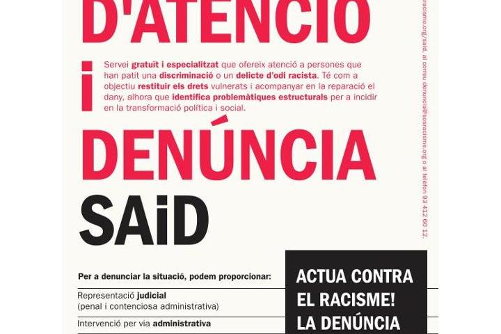 El Servei d’Atenció i Denúncia (SAiD) ofereix atenció gratuïta i especialitzada a persones que han patit una agressió, discriminació o violència racista de qualsevol tipus. El SAID és un servei únic a Catalunya; ha acompanyat a més de 10.000 persones en 30 anys de funcionament. El seu objectiu és restituir drets i promoure la transformació social i política.