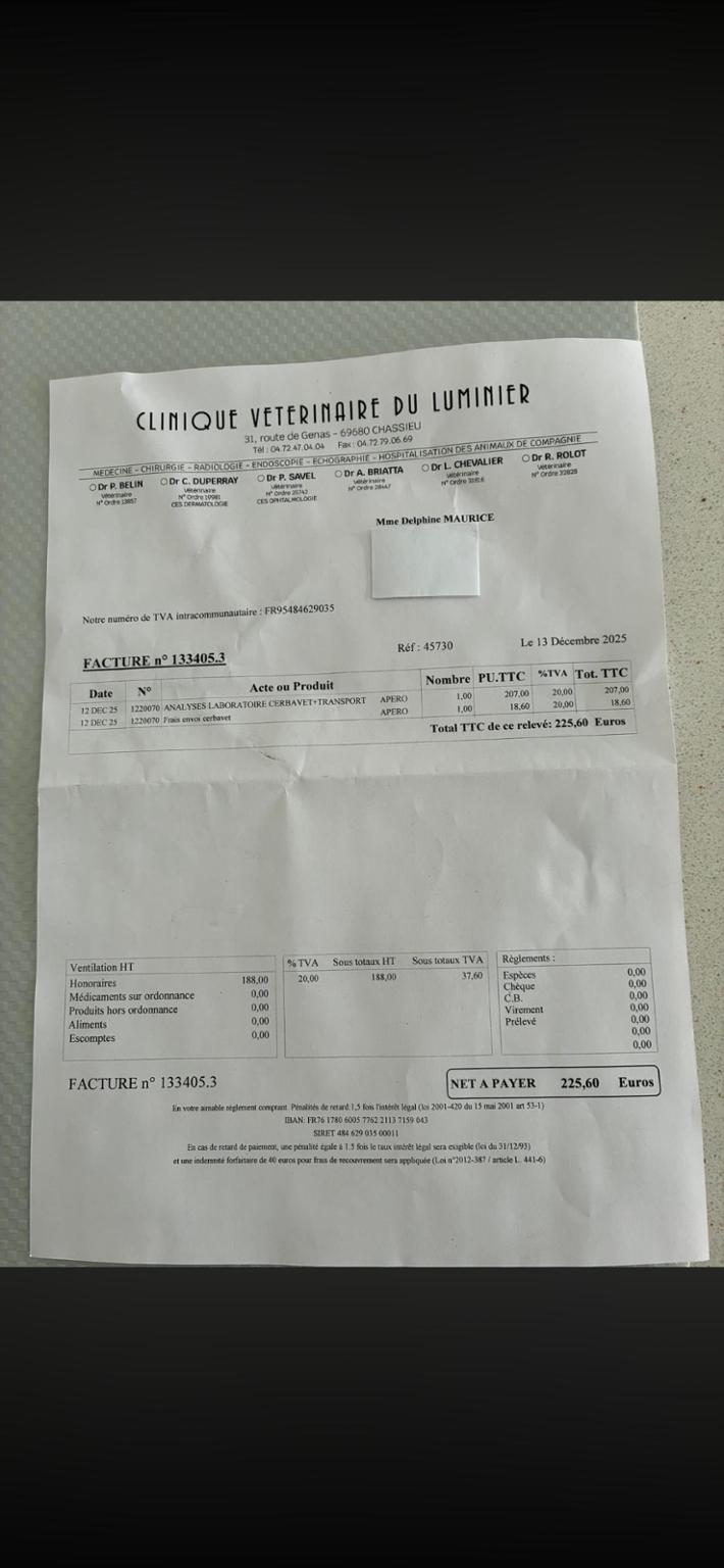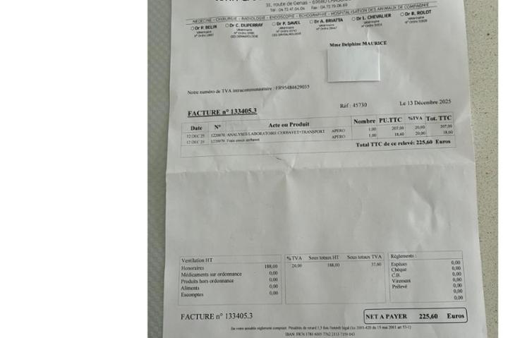 Bonjour à tous, voici des nouvelles du petit Apéro qui a reçu les résultats de sa PCR, il a un calicivirus très important, ses gencives sont rouge sang donc pour le moment on essaye un peu de cortisone pour calmer la douleur . Côté respiratoire cela va mieux . Le vaccin est repoussé . C’est un adorable chaton très câlin qui adore les bisous . Ci-joint la facture des analyses (225,60€) . Il a aussi été castré et identifié cette semaine . Merci pour les partages