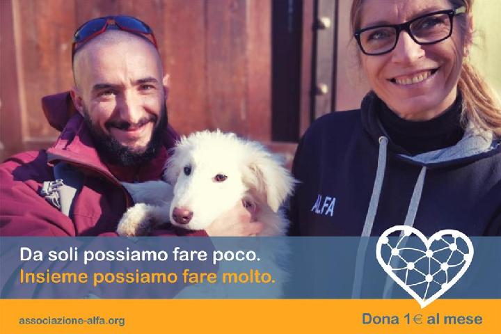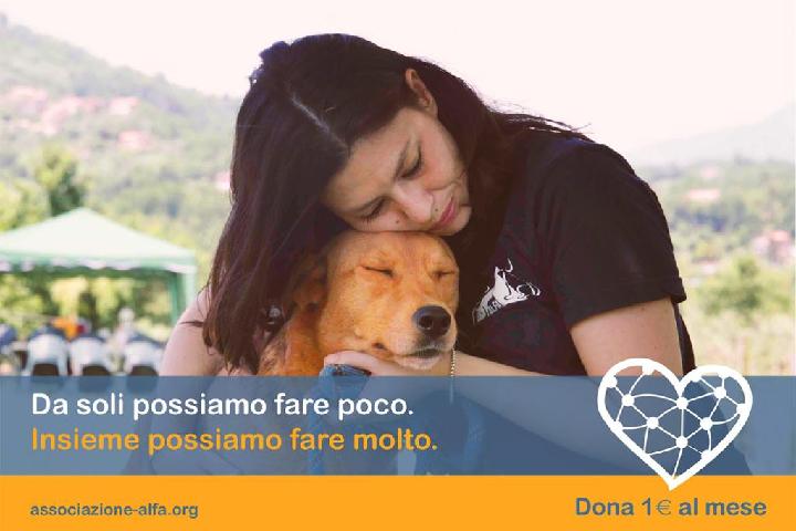 Il progetto d’amore di ALFA è destinato a tutti i cani e gatti abbandonati che meritano salute, diritti e libertà, attivando campagne ed eventi di adozione e prevenzione per i nostri amici a 4. Da soli possiamo fare poco. Insieme possiamo fare molto! Entra a far parte del gruppo #Teaming di ALFA e con 1€ al mese sostieni il nostro progetto per salvare centinaia di animali abbandonati!