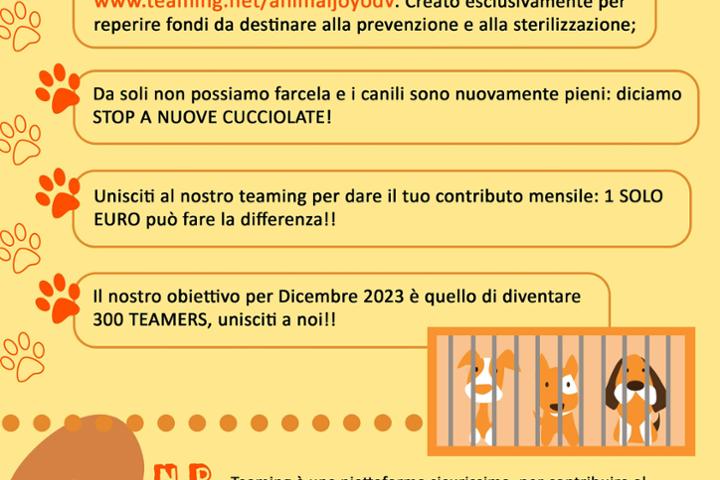 Questo gruppo teaming nasce per supportare l'attività dell' Associazione Animal Joy OdV. L' Associazione nasce ed opera in provincia di Roma a favore dei cani presenti nei canili, promuovendo adozioni consapevoli e favorendo azioni di prevenzione del randagismo. Unisciti a noi! In tanti possiamo fare tanto!