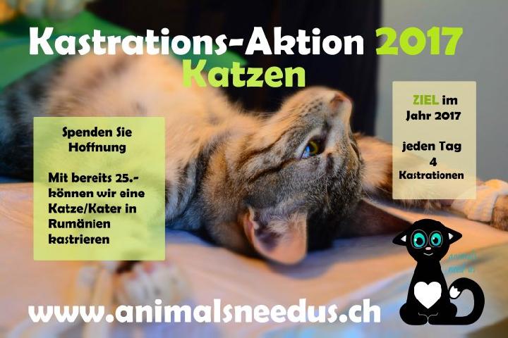 Auch im Jahr 2017 steht die Tierschutzarbeit von Animals Need Us ganz im Zeichen der Kastration. Schenken Sie Hoffnung – Wir sehen Kastrationen langfristig als effektivste Tierschutzmaßnahme um nachhaltig das Elend hungernder und kranker Katzen zu durchbrechen. Zwei tolle Tierärzte in Bukarest, die auch schon im Jahr 2016 unsere Kastrations-Aktion durchgeführt haben sind auch im Jahr 2017 mitdabei. Helfen Sie mit um das Leid der Strassenkatzen zu minimieren. www.animalsneedus.ch
