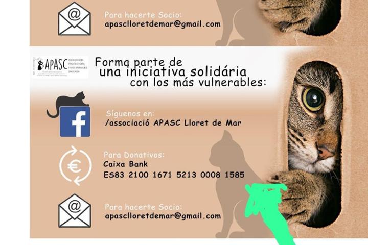 APASC (Asociación Protectora de Animales Sin Casa) was born in 2012 with the aim of joining forces to confront the situation of lack of protection and vulnerability in which homeless animals (cats and dogs mainly) in Lloret de Mar find themselves. We are a non-profit association dedicated to controlling, feed, sterilize and heal colonies, as well as to protect the furry animals that need it the most. Join us!
