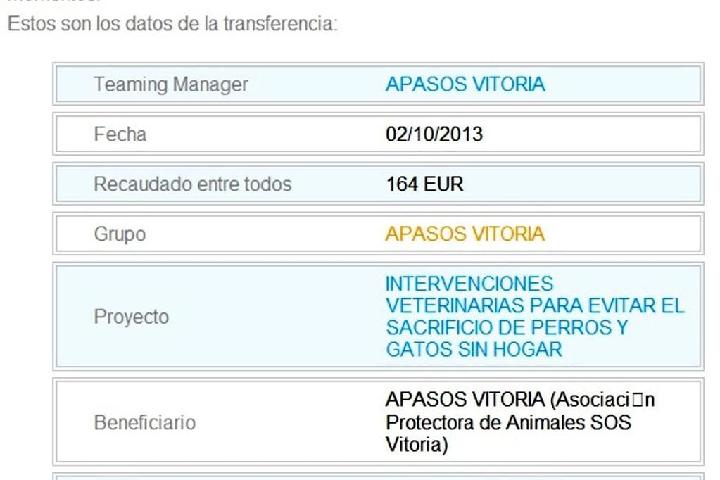 (A.P.A. SOS VItoria) Asociación Protectora de Animales SOS VItoria es una ONG sin ánimo de lucro formada por voluntarios desde el año 2004. Nuestra finalidad es conseguir el máximo grado de protección y bienestar de los animales abandonados y evitar el sacrificio de los mismos por el mero hecho de haber muchos. Nos hacemos cargo de todos los gastos veterinarios (operaciones, tratamientos, medicación, etc.) ¡Ayúdanos a ayudarles con tu euro! http://www.apasosvitoria.org