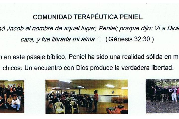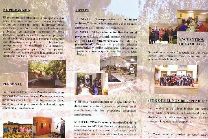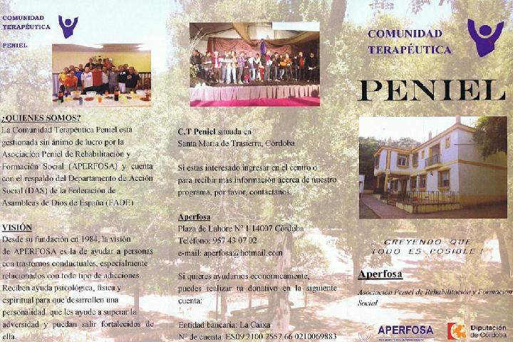 El programa C.T. Peniel está dirigido a personas con problemas de adicción, depresión y otros trastornos conductuales. El programa pretende ser el medio que ayude al individuo a encontrar una alternativa a su problema. El objetivo es la rehabilitación y la insercción sociolaboral. BUSCAMOS APOYO ECONOMICO PARA UNA PERSONA QUE QUIERA REHABILITARSE Y NO TENGA RECURSOS ECONOMICOS. EL COSTE DE UNA PLAZA ES DE 450€ MENSUALES
