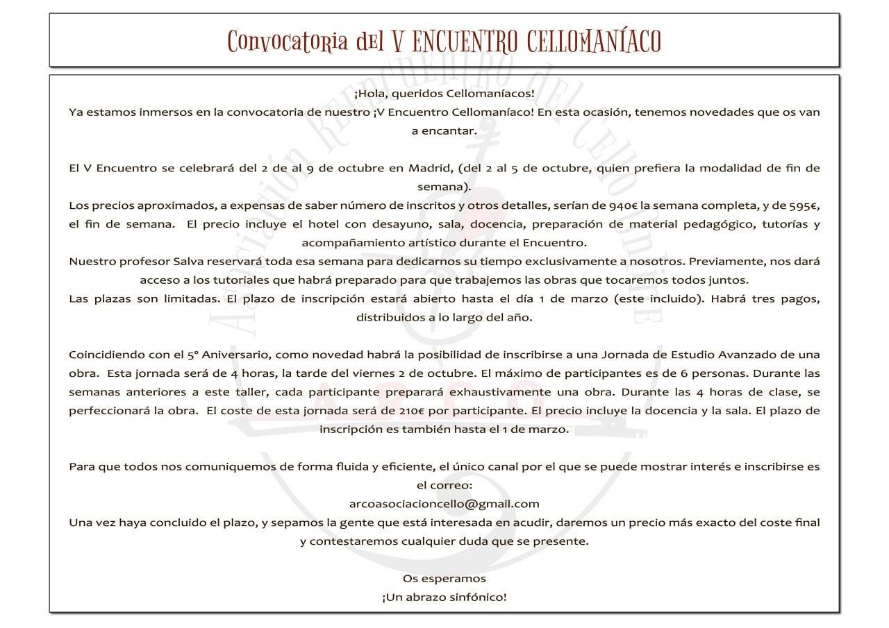 Somos una asociación de estudiantes del cello online que residimos en diferentes lugares del mundo. Queremos promocionar el estudio del violoncello a personas adultas sin límite de edad que tengan interés en aprender a tocar el instrumento y que ahora pueden descubrir cuán gratificante es hacerlo. Web: https://arcoasociacion.org/