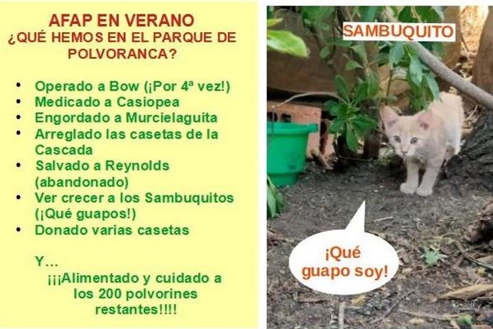 At AFAP Polvoranca we take care of +200 cats that live in the park. In its 150 hectares, unwanted, old or sick pets are abandoned. Our challenge is to feed them, sterilize them so that they have a better life and give them all the love we can. With every Teaming euro we buy 1 kilo of feed. Remember: 1 euro = 1 kilo of feed = 1 cat fed for 1 week. Your euro works! | Join us! |BIZUM: 629 052 221 | DONATE: ES85 3067 0156 6334 7041 6128 | SHARE: https://es-es.facebook.com/groups/gatosdepolvoranca