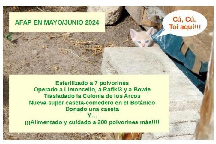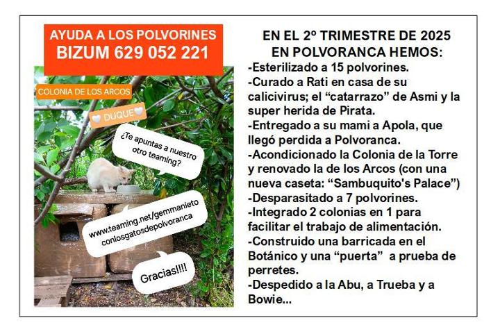 Thank you for continuing to support the wonderful work of caring for the cats at Polvoranca Park. With your help, we know they will always be well cared for. Thank you!!! In February, March an April 2025, we have STERILIZED 15 "polvorines" | • CURED Rati, Asmi, and Pirata | • GIVEN Apola, who arrived lost in Polvoranca, back to her mother | • REFURBISHED the Torre Colony and RENOVATED the Arcos Colony | • DEWORMED 7 cats| • BUILT a barricade at the Botanical Garden and a dog-proof "door" | • SAID GOODBYE to Abu, Trueba, and Bowie... | • FED THE 250 polvorines who live at Polvoranca Park... with almost 750 kilos of feed!!! and more than 300 CANS OF WET FOOD!!! | • and we've also given them all the LOVE WE CAN. DONATE MORE THAN 1 EURO, DON'T THINK ABOUT IT, GIVE THEM A BIZUM • BIZUM: 629 052 221 • DONATE: ES85 3067 0156 6334 7041 6128 • SHARE: https://www.facebook.com/groups/gatosdepolvoranca | Thank you! Gemma, AFAP Polvoranca
