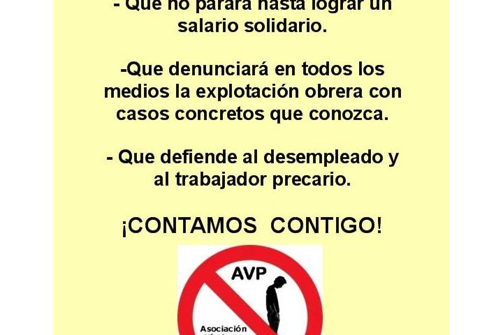 Sufragar los gastos habituales de una asociación, acudir a reuniones, gastos de telefonía, web y organización de eventos para dar a conocer la asociación y conseguir que todos los desempleados tengan una renta mínima garantizada mientras no tengan trabajo a tiempo completo. El beneficiario será la Asociación Víctimas del Paro porque defiende a los desempleados, trabajadores en precario y las personas con pocos ingresos. Los fondos están vehiculados a través de una cuenta particular.