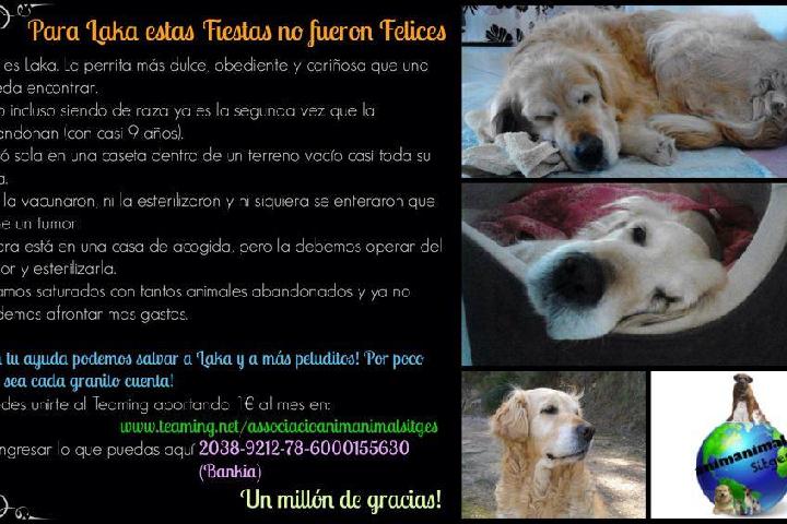 El dinero que recojamos con las aportaciones, será destinado para la operación de LAKA, golden de 9 años, abandonada por segunda vez, de la que nuestra asociación se ha hecho cargo y que ha de operarse de un tumor en una mama y también se ha de esterilizar.