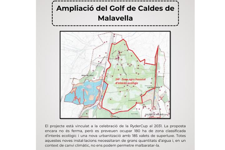 S'ha fet pública l’oposició de la Generalitat al «projecte especulatiu» (dit e boca pels propis portaveus del Govern) associat a la celebració de la Ryder Cup 2031 a Caldes de Malavella. Des de les entitats i partits signants d’aquest comunicat celebrem i compartim aquest posicionament. Des que vam saber que la celebració de l’esdeveniment requeria per ser rendible de l’ampliació de les instal·lacions actuals del golf (Camiral Golf & Wellness) en un espai catalogat a nivell municipal com d’interès ecològic i agrari, vam mostrar la nostra oposició tant a l’ajuntament, representat per l’alcalde Salvador Balliu, com en diversos actes a Caldes de Malavella i resta de pobles.