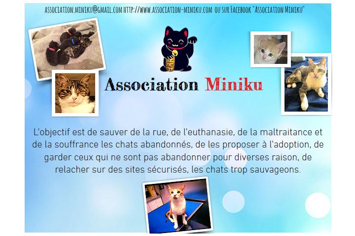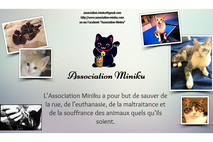 L'objectif de l'Association Miniku est de sauver de la rue, de l'euthanasie, de la maltraitance et de la souffrance les chats abandonnés, de les proposer à l'adoption, de garder ceux qui ne sont pas adoptables pour diverses raisons, de relacher sur des sites sécurisés, les chats trop sauvageons.