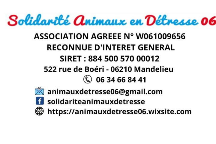 Created in 2017 and recognized as being of general interest, SOLIDARITE ANIMAUX EN DETRESSE 06 (from Mandelieu) provides emergency food aid to more than 900 animals in distress (islands of free cats, homeless animals or in precarious homes) thanks to its numerous collections in supermarkets (an average of 2 TONS PER MONTH is distributed). His small team is entirely dedicated and volunteers. The association lives only on private donations.
