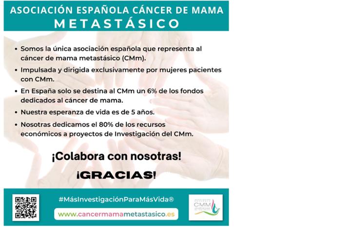 El cáncer de mama metastásico es una enfermedad que, a día de hoy, no tiene cura. En la asociación de cáncer de mama metastásico trabajamos para que las pacientes con esta enfermedad puedan seguir teniendo esperanza, para que la investigación no cese. ¿Nos ayudas?