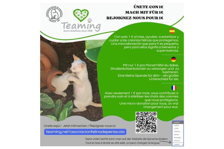 La Asociación ANÍMICA es una entidad sin ánimo de lucro que tiene como fines el control de colonias felinas y la búsqueda de adopción responsable de gatos y perros abandonados y/o callejeros, además de la concienciación social frente al abandono, el maltrato y otros temas relacionados con la protección animal. Con esta cuenta de Teaming queremos tener un pequeño "colchón" para urgencias. Si quieres hacernos una donación de otro importe esta es nuestra cuenta: ES31 0073 0100 5005 0496 7353