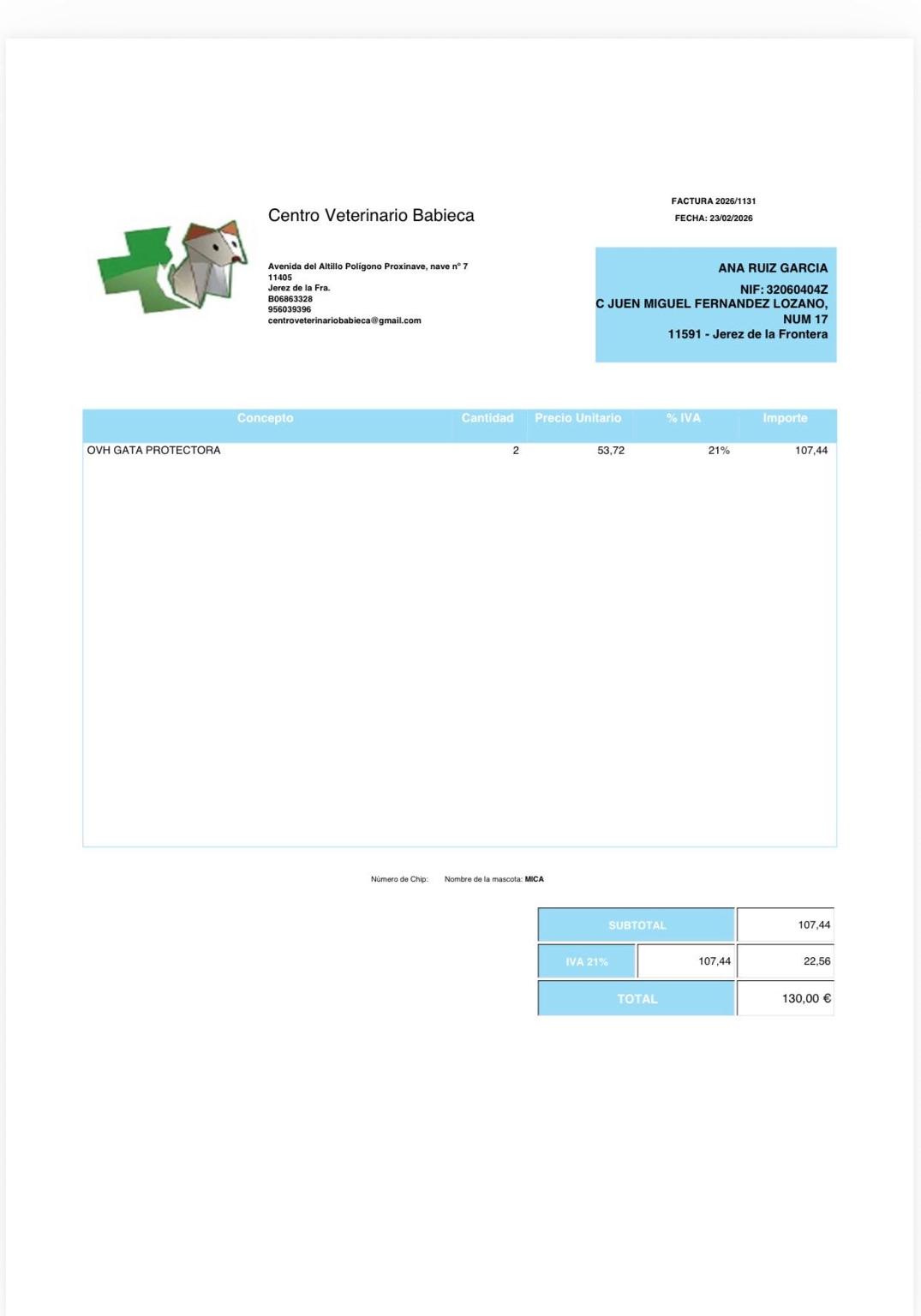 Nueva factura castracion 2 gatas