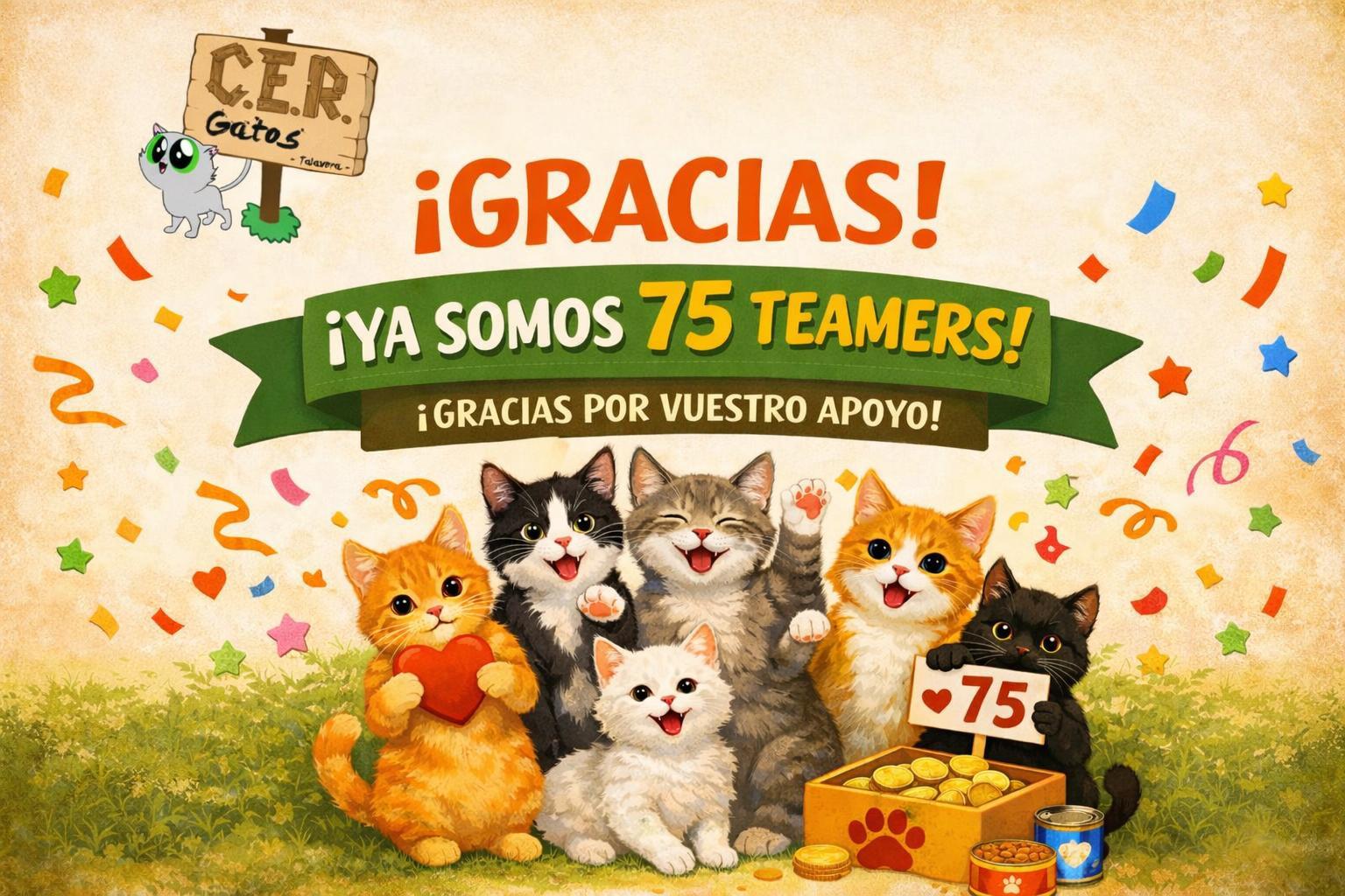 Hemos conseguido la cifra de 75 Teamers y estamos muy agradecidos y animados a seguir con la causa. Todos los gatos de Talavera importan, luchamos por su cuidado y alimentación día tras día y gracias a tu aportación podemos darles más esperanzas y una vida más digna. ¡¡¡MUCHAS GRACIAS POR TU APOYO!!!