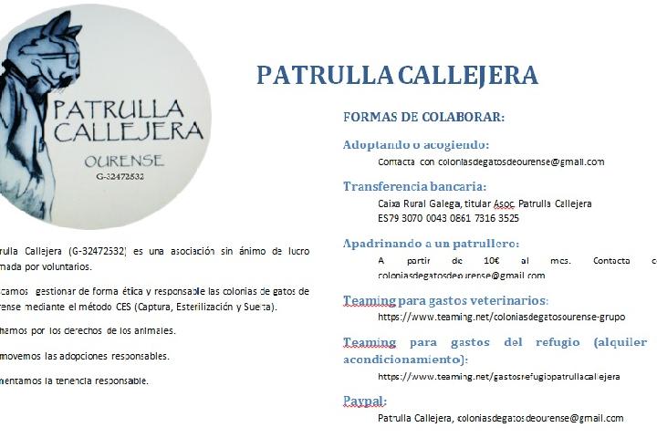 Patrulla Callejera está formado por un grupo de personas voluntarias que formaron una asociación sin ánimo del lucro que no recibe ningún tipo de ayuda económica ni subvención por parte de ninguna institución. Los gastos son muy elevados, ya que nos hacemos cargo de las castraciones de las colonias de gatos de ourense, alimento y tratamiento veterinario cuando es necesario. Actualmente tenemos más de 40 gatos en acogida a la espera de encontrar adopción. Si te apetece colaborar puedes hacerlo
