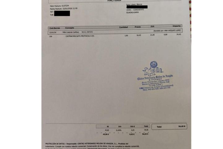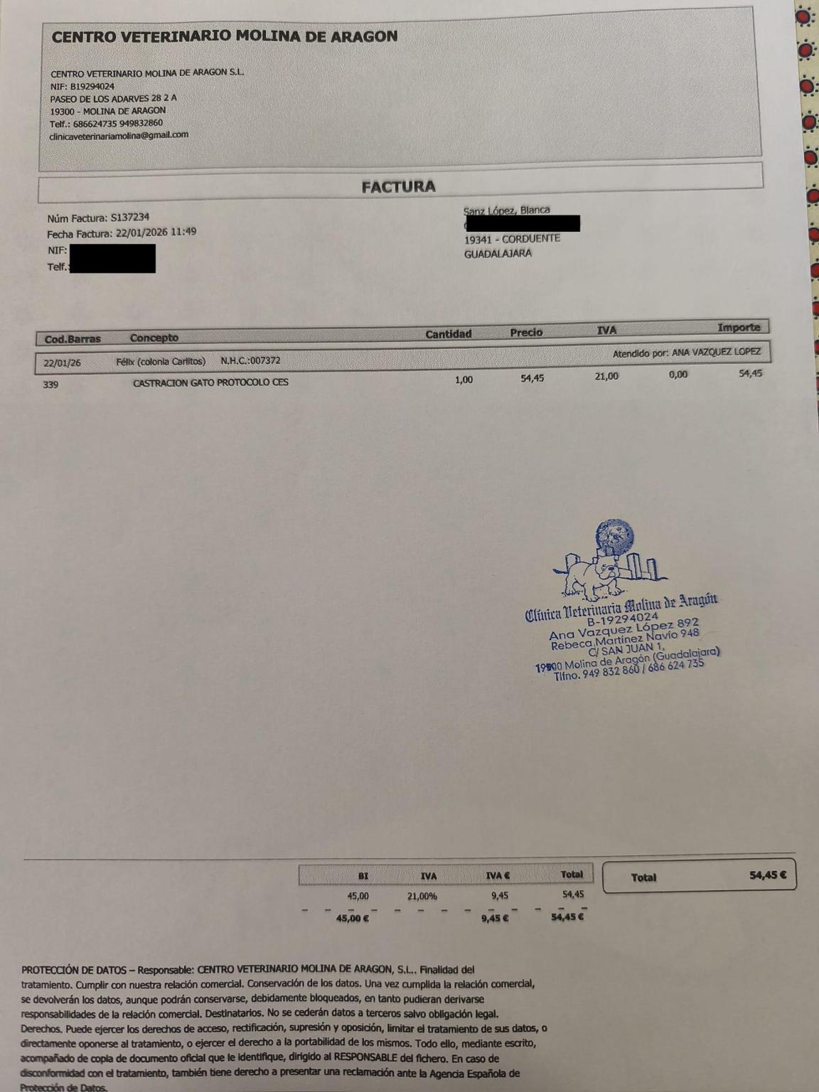 Aportamos factura de la esterilización de Félix pagada con los últimos 52,10€ que nos quedaban de los 161€ solicitados a Teaming (para pagar la factura total de Félix se han utilizado 2,35€ procedentes de donativos a favor de Colonias felinas de Corduente.