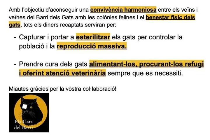Amb l’objectiu d’aconseguir el benestar físic dels gats, tots els diners recaptats serviran per: (1) Capturar i portar a esterilitzar els gats per controlar la població i la reproducció massiva. (2) Prendre cura dels gats alimentant-los, procurant-los refugi i oferint atenció veterinària sempre que es necessiti. Amb només 1€ al mes es poden fer moltes Miaucures! Miautes gràcies per la vostra col·laboració!