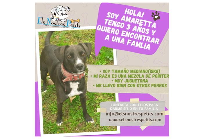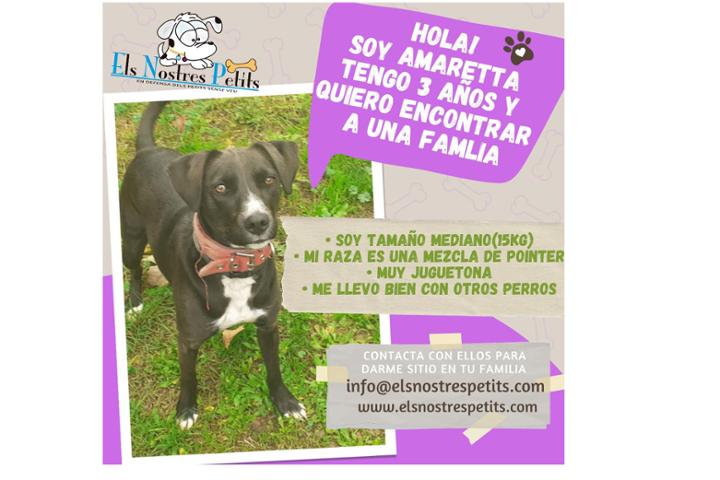 Con vuestra ayuda va destinada exclusivamente a Amaretta que como sabéis lleva 3 años en la asociación y necesita unos cuidados especiales ya que necesita etologos para modificar su conducta ya que cuando va por la calle tiene reacion a ir a por otros perros pero es su trauma ya que desde pequeña estaba atado en una cadena y ese trauma es difícil de quitar. Esta actualmente en una casa de acogida que le está dando mucho amor y ojalá encuentre una familia que le quiera porque además nadie pregunta por ella.