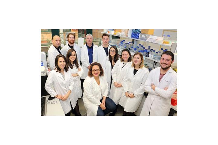 De izda a dcha: Representantes de ENACH Asociación Tony Moreno y Naza Martínez con sus hijas Inés y María (PLAN) junto con Antonio López. Representantes del INc-UAB Dr. Jesús Giraldo, Director del INc-UAB, el Dr. Albert Quintana y la Dra. Elisenda Sanz, del grupo de Neuropatología Mitocondrial.