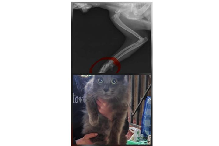 Ahora ya con una radiografía, sabemos que Hummus seguramente fue atropellado, ya que tiene la pata fracturada. Es operable, pero debe hacerlo un traumatologo externo y por ello necesitamos reunir el dinero lo antes posible, porque Hummus lleva semanas con ese dolor