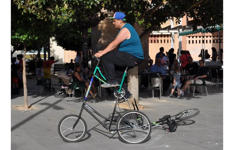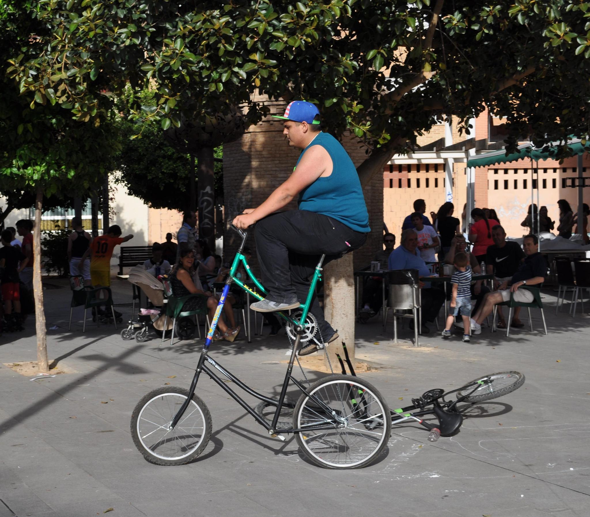 Aquí os dejo esta foto maravillosa de Ginés en la Tall-bike, que se construyó en aquel grandioso inicio del Sobre Ruedas. Nos gusta que el barrio fluya.
