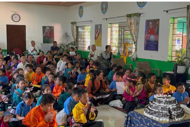 Foto celebrando el 90 aniversario del Dalai Lama con la visita del Ven Khempo Ngedhon Tenzin Rimpoche, el cual tiene el pequeño monasterio cerca de estos campamentos, donde pusimos una pequeña potabilizadora