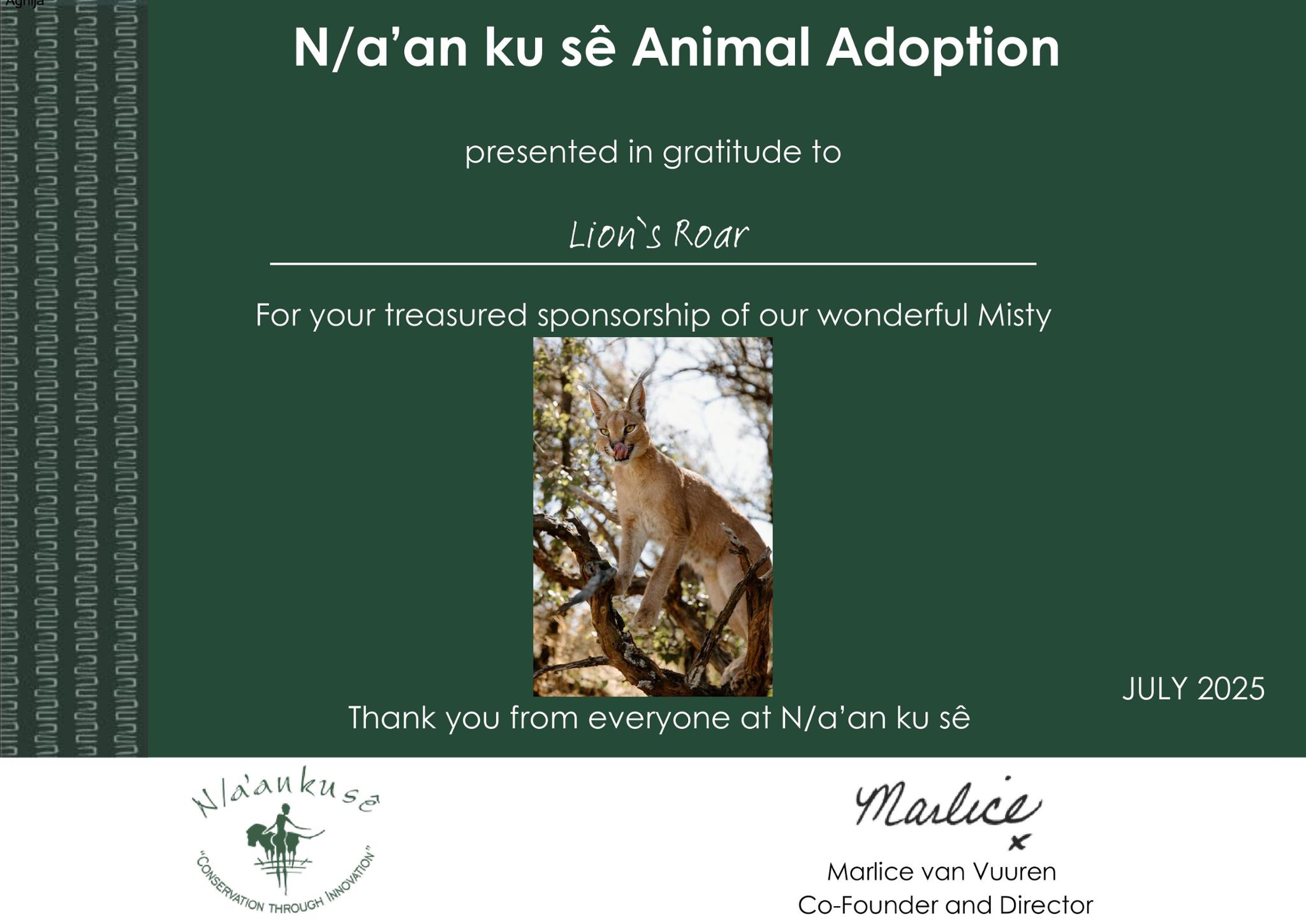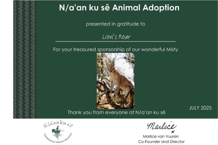 La bella Misty, es re adoptada por un año más. Esta en perfecto estado y goza de buena salud, aunque se va haciendo mayor y por eso ha sido retirada de sus funciones oficiales, mostrando sus habilidades innatas y así colaborando con la conservación de la especie.