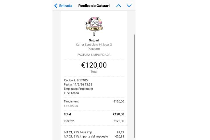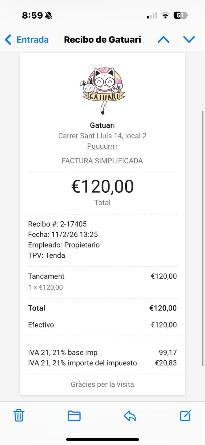 Factura pago cerramiento ventana para gatito Skar en acogida. Servicio realizado con Gatuari