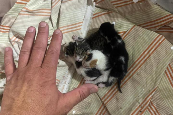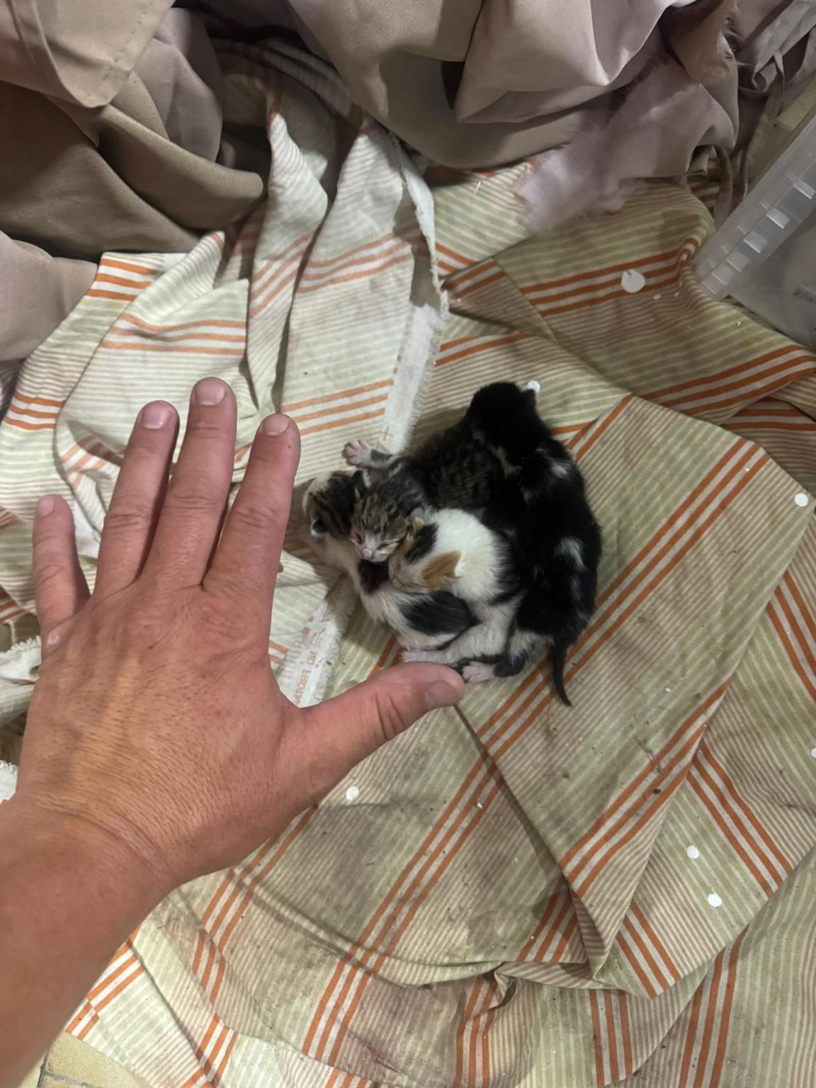 Una vez allí, vimos la cruda realidad...una madre intentando proteger a sus bebés, en un lugar hostil. Los había movido de sitio, intentando alejarlos del peligro... Una de nuestras voluntarias, con mucha paciencia y mimo, colocó estratégicamente varias jaulas con comida húmeda dentro, a la espera de que la mamá pudiera entrar. Finalmente y tras un rato de espera, conseguimos capturar a la mamá. Acto seguido, con mucho cuidado y con guantes puestos para no contaminar el olor de los bebés, los metimos en un trasportín rumbo a su casa de acogida.