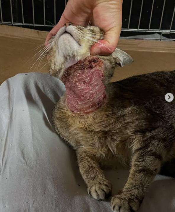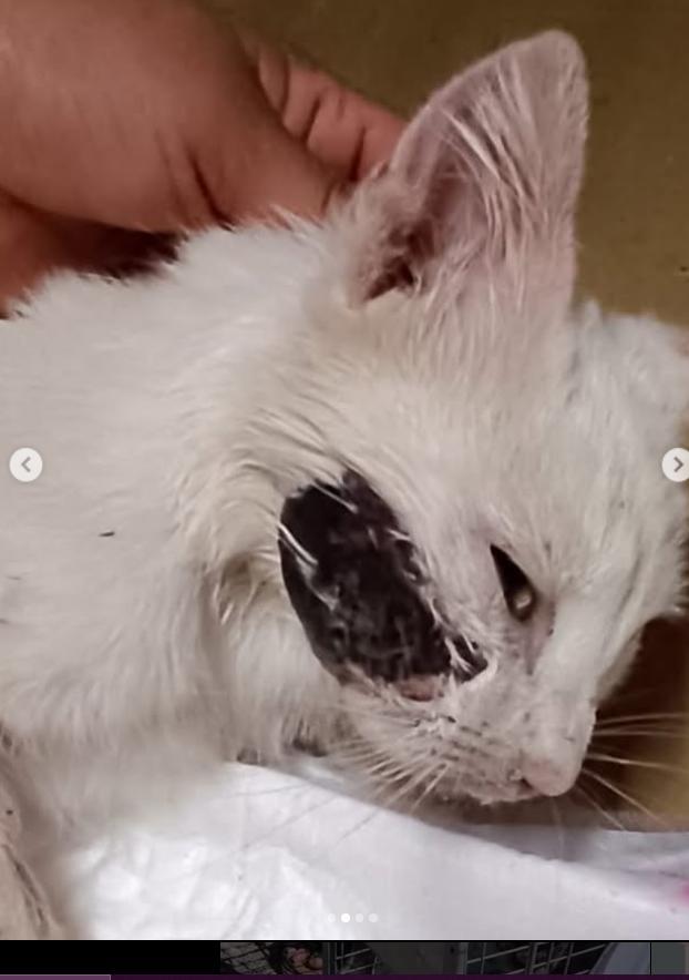 Lamentablemente, su estado es muy grave: está severamente desnutrido y presenta una herida en la cara con signos de gangrena e infestación de gusanos. A pesar de todo, estamos haciendo todo lo posible para salvarle la vida y darle una oportunidad de recuperación.