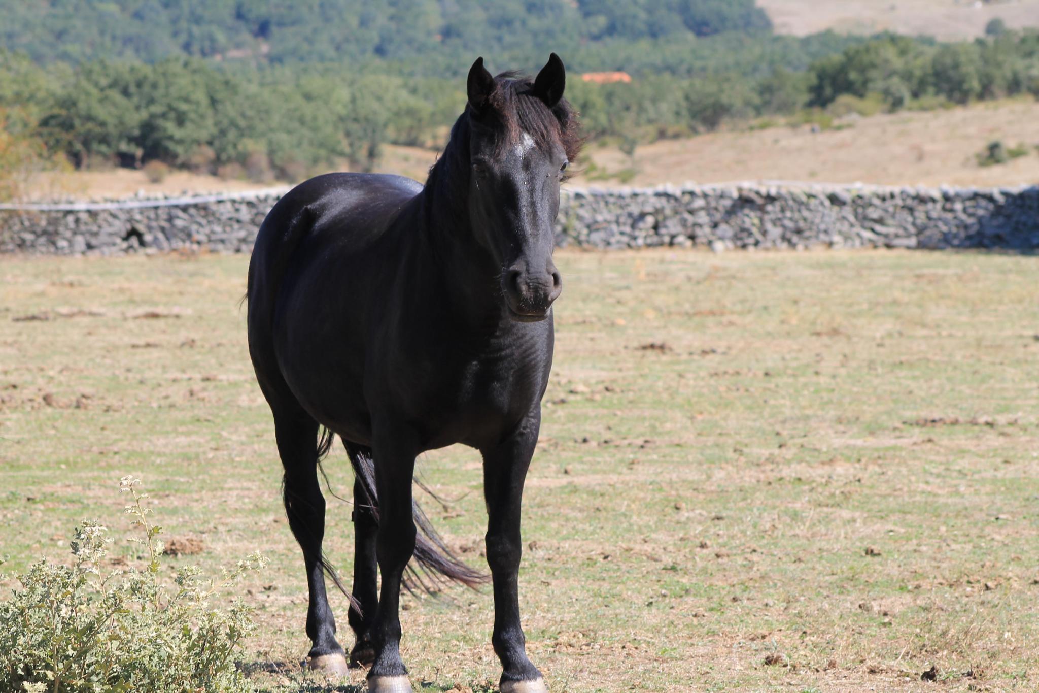Él es un Pura Raza Español, nacido en una yeguada de renombre 4 años antes, tuvo la mala(o buena, según se mire) suerte, de hacerse una herida en una pata, esa lesión se curó, pero se le quedó una gran marca, entonces ¿Quién va a comprar un coche bueno con un rayajo? Su destino era el matadero, pero una persona que le cuidaba buscó darle una vida digna y aquí llegó con su larga melena negra, un corazón enorme, casi tan grande como lo es él, además tiene un temperamento fuerte, pero es un gran protector, tanto de su manada como de los humanos. Cuando llegó al Santuario, hubo mucha gente interesada en adoptarle y es que la gente pensaba tener un precioso caballo y encima barato, por eso decidimos que no saldría del Santuario, no quisimos que fuese el capricho de nadie.