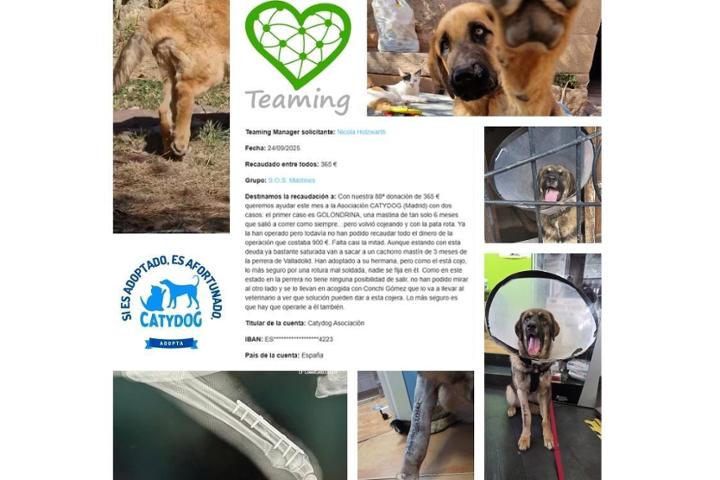 Queríd@s teamers: con nuestro teaming nº 87 de 364 € queremos ayudar este mes a la pequeña protectora La Guarida de Puente Genil (Córdoba) que se ha hecho cargo en un espacio de 3 semanas de 9 mastines.