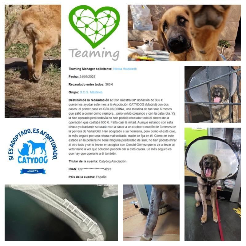 Querid@s teamers: con nuestra 88ª donación de 365 € queremos ayudar este mes a la Asociación CATYDOG (Madrid) con dos casos: el primer caso es GOLONDRINA, una mastina de tan solo 6 meses que salió a correr como siempre…pero volvió cojeando con la pata rota. Ya la han operado pero todavía no han podido recaudar todo el dinero de la operación que costaba 900 €. Falta casi la mitad. Aunque estando con esta deuda ya bastante saturada han sacado a LANGY, un cachorro mastín de 3 meses, de la perrera de Valladolid. Han adoptado a su hermana, pero como él está cojo, lo más seguro por una rotura mal soldada, nadie se fijaba en él. Como en este estado en la perrera no tenía ninguna posibilidad de salir, no han podido mirar al otro lado y se lo llevaron en acogida con Conchi Gómez que lo va a llevar al veterinario a ver que solución pueden dar a esta cojera. Lo más seguro es que hay que operarle a él también. Todo esto va a costar mucho dinero, pero gracias a vuestro euro mensual podemos ayudar un poco a pagar una pequeña parte de estas facturas.