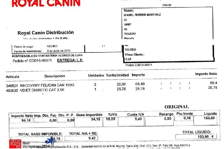 Buenas tardes a todos los amigos de Dandi. Subo el justificante de pago del último pedido que hice a Royal Canin. En él estaba incluido, no sólo el pienso Diabetic para Dandi sino también el de Baloo, el de otros enfermitos y el de los ancianetes. Siento haber tardado tanto en hacerlo pero me ha sido imposible antes.