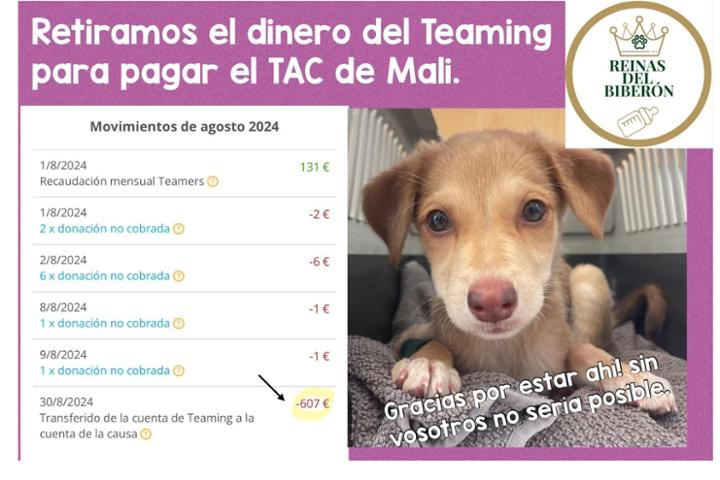 Os comunicamos que hemos retirado lo que había en la hucha de este Teaming para hacer frente a los gastos veterinarios de urgencia de varios de nuestros cachorros ingresados, que ha ascendido a casi 2.500€