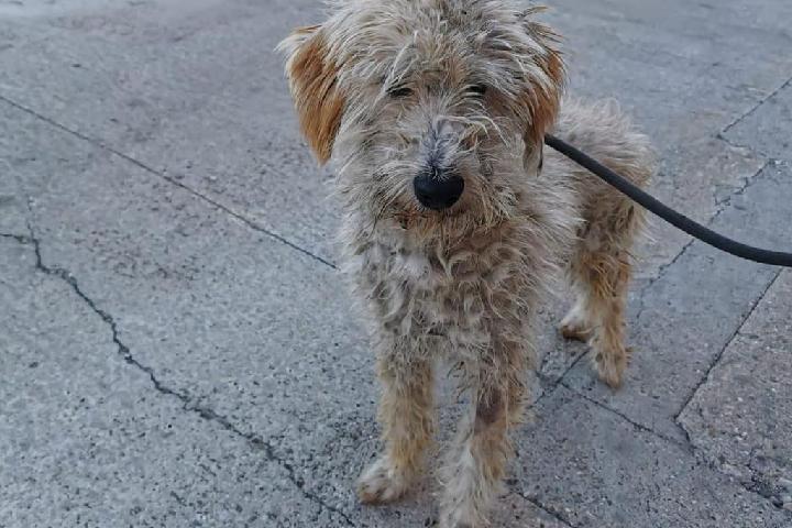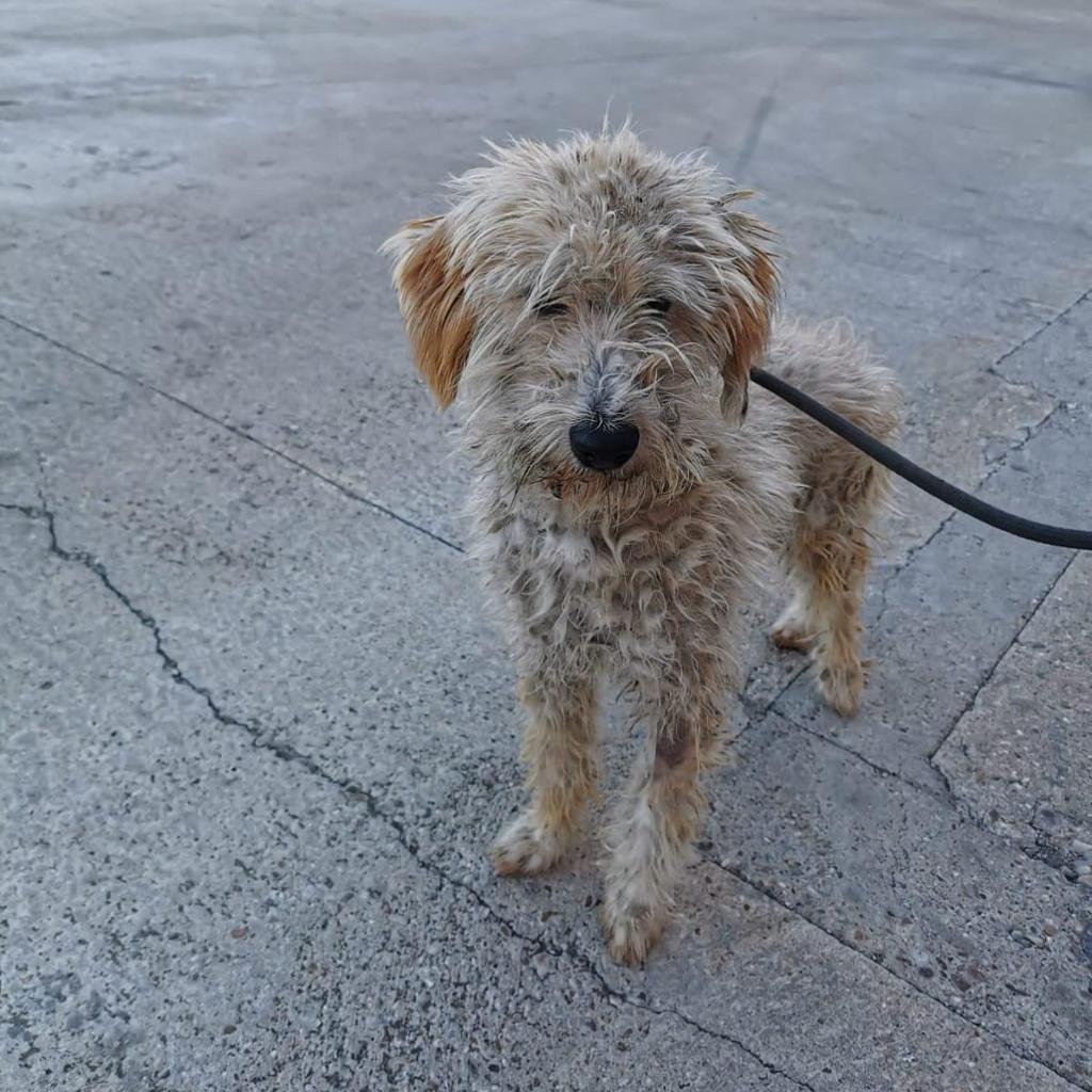 De Koko sabemos que llegó a la perrera en unas condiciones totales de abandono, lleno de nudos, sucio, delgado, se nota que no lo han tratado bien.