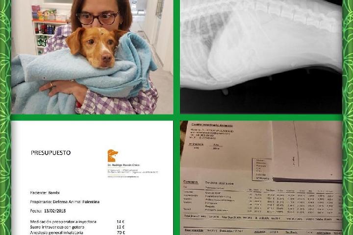 Como sabéis el domingo nuestra pequeña Bambi tuvo un accidente. Jugando en el patio con su compañero en la casa de acogida, una vecina abrió la puerta y ella escapó corriendo, con tan mala suerte que fue a parar a una nacional donde fue atropellada y nadie paró para auxiliarla. Su casa de acogida tuvo que ponerse en medio de la carretera para que no la volvieran a atropellar. Fuimos rápidamente a por ella y la llevamos a la clínica Animalia de Valladolid que estaba de urgencia. Allí se nos comunicaba el peor diagnóstico posible, tenía la columna fracturada en la mitad, lo que provoca tensión en las patas delanteras e inmovilidad de las traseras. Hoy la hemos trasladado a la clínica Neptuno donde le han hecho una exploración neurológica a fondo compatible con la cirugía (aunque mañana el traumatólogo la revisará antes de operar). Su única posibilidad para dejar de tener dolores y para que vuelva a caminar es la operación. No hay 100% de garantías, pero no queda otra opción. Como sabéis mañana también se le hace resonancia a Víctor, 300€ que se han recaudado y los 70€ restantes destinados a la operación de Elmo que son 950€ que aún no hemos podido pagar. La factura de Bambi del fin de semana está abonada con lo obtenido en el mercadillo, son casi 200€. Y a mayores tenemos que pagar en Neptuno las pruebas de hoy y el ingreso hasta su alta. Os necesitamos. Bambi os necesita. Cualquier aportación por pequeña que sea, podéis hacerla aquí. Recordad que es mañana su operación. Se agradece difusión.
