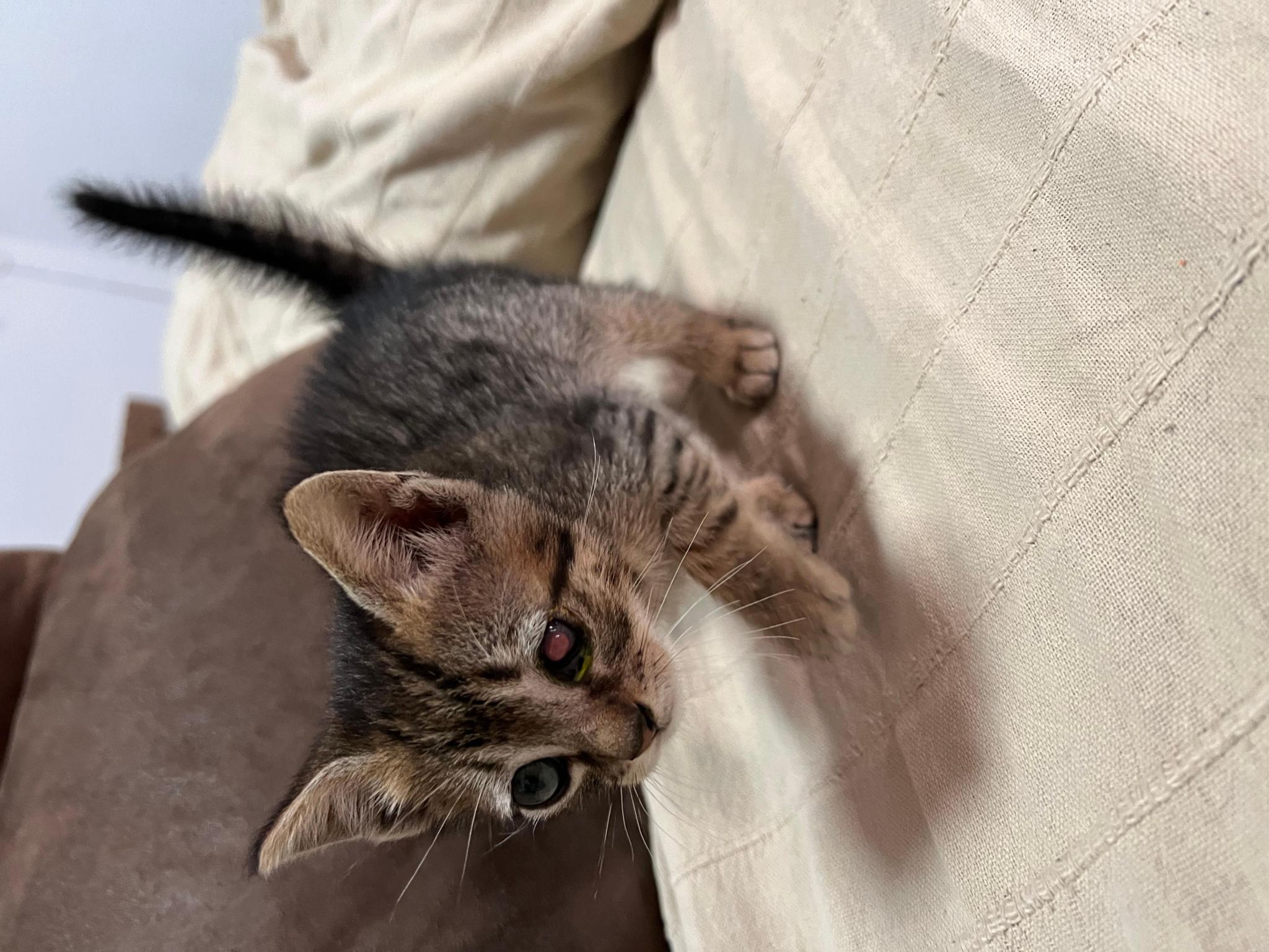 Este bebé tiene un ojo ulcerado que le impide la visión. Es minusculo, su mamá es de tamaño “bolsillo” y el bebé ha heredado la misma constitucion. Es pequeñisimo.