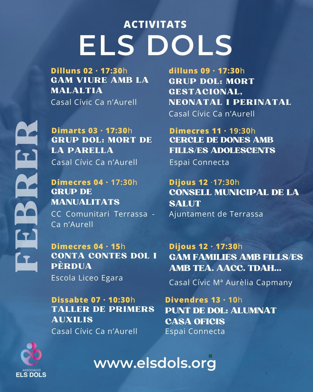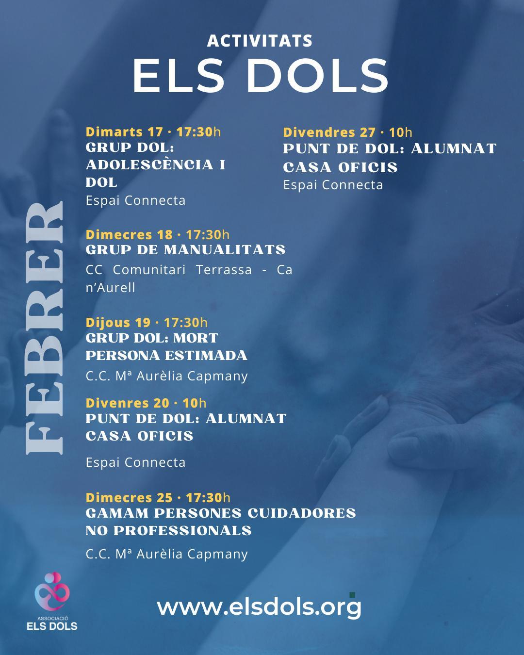Els Dols és una Associació sense ànims de lucre on intenten trencar el tabú sobre el dol i la pèrdua. Acompanyar, normalitzar i formar, per normalitzar el procés d’adaptació del que significa el dol. A través de tallers infantils, formacions, trobades… tot és possible per entendre i adaptar-se al camí de les llàgrimes.