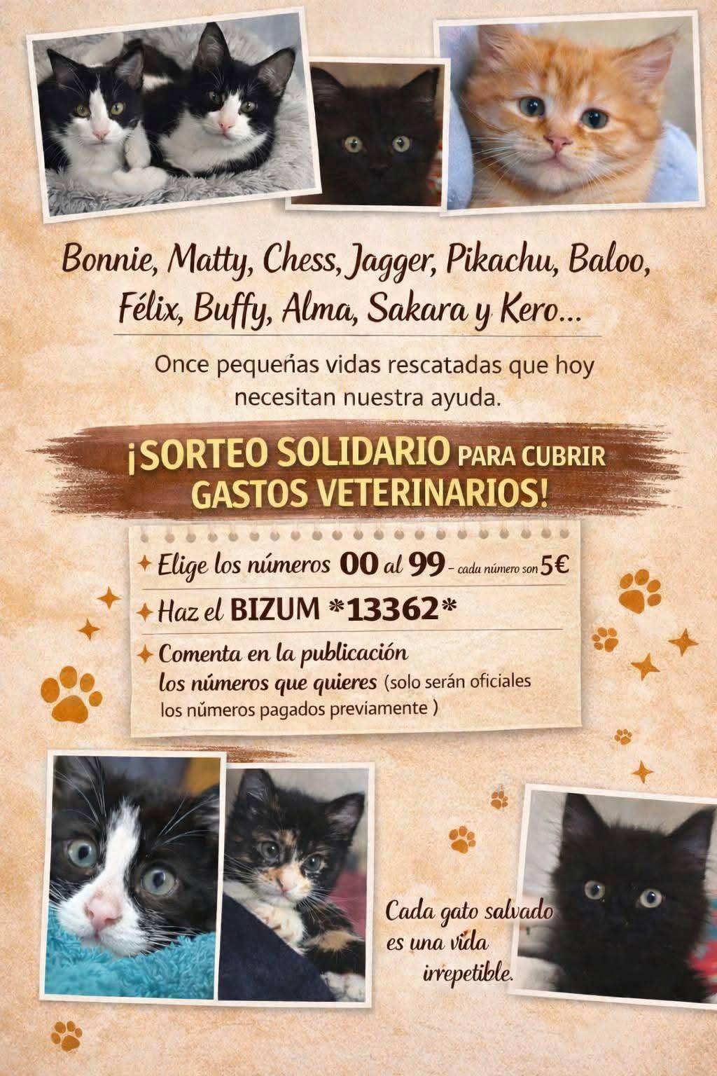 En nuestras redes sociales tenemos activo un sorteo para recaudar un poco más. El premio es un maravilloso lote de productos para gatos (valorado en más de 120€) y puedes adquirir cada número con un bizum de 5 euros.