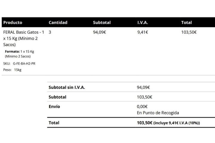No os subí factura de Pienso Feral porque hemos estado comprando pienso y latas de supermercado (y los tickets iban en conjunto con compras personales) pero acabo de hacer otro pedido de pienso (que de momento combinaremos con pienso de supermercado, salvo que consigamos aumentar el número de Teamers para cubrir gastos).