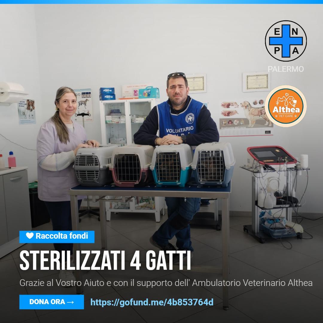 Aiutaci a sconfiggere il randagismo nella provincia di Palermo! Useremo le tue donazioni per sterilizzare e curare quanti più cani e gatti possibile nei comuni di Carini, Capaci, Cinisi, Isola delle Femmine e Torretta, dove operiamo da anni promuovendo e ricercando la collaborazione dei comuni. Siamo un gruppo esiguo di volontari che non si arrende alla difficile situazione dei randagi in Sicilia e lavora su diversi piani per cambiare le sorti di chi non ha voce. Visita i nostri canali social e il nostro sito per vedere con i tuoi occhi cosa facciamo.