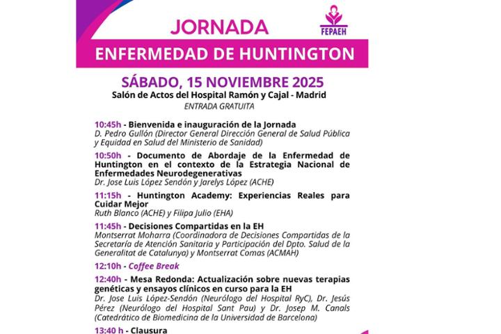 Con motivo del Día Mundial de la Enfermedad de Huntington, el próximo miércoles 13, desde FEPAEH organizamos una Jornada sobre la Enfermedad de Huntington el sábado 15 de noviembre en el Hospital Ramón y Cajal de Madrid, a partir de las 10:45 h.