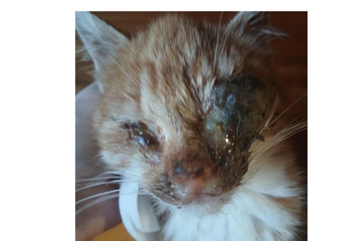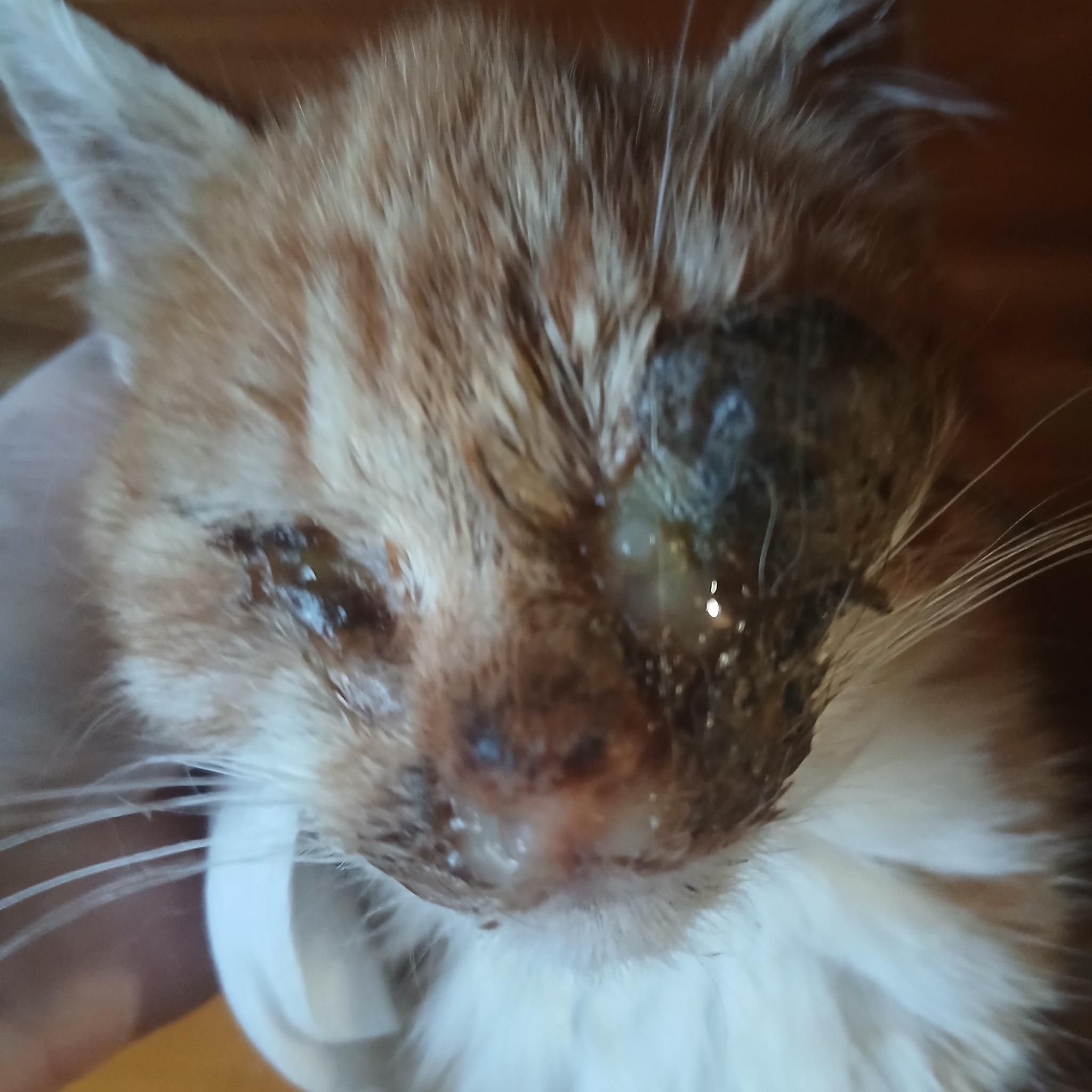 Zu Hause haben wir die Kätzchen gewaschen und noch am selben Abend mit ihrer Behandlung begonnen. Wir wollen das rote Kätzchen einem Augenarzt zeigen, da die Situation ernst ist.