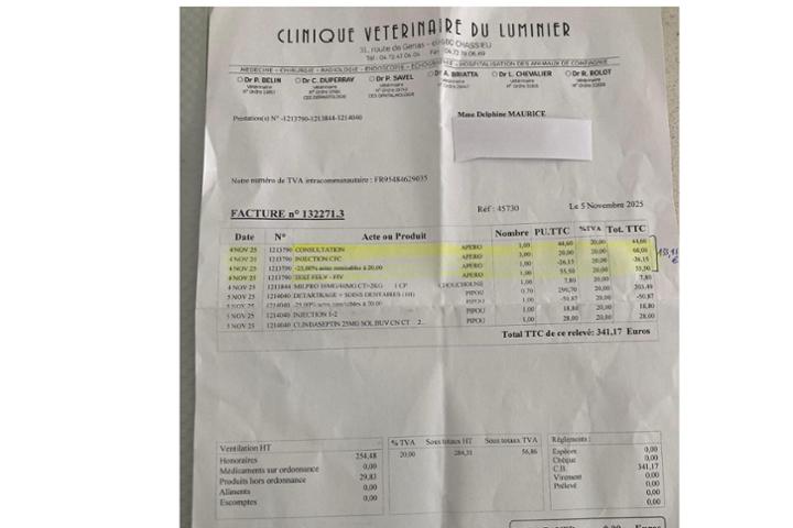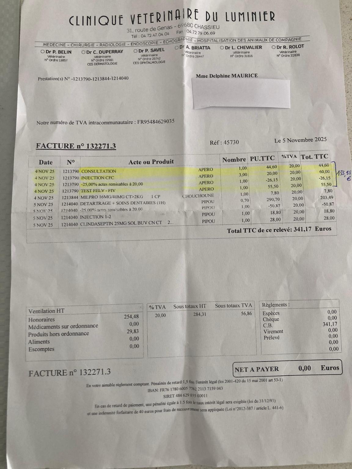 2ème injection chez le vétérinaire pour Apéro , chaton d’environ 8 mois , adorable. Il a une grosse gingivo stomatite dû probablement au Calicivirus et il commence à mieux respirer bien qu’il reste pris . On continue le traitement et les inhalations. J’ai joint la facture le concernant par transparence comme à chaque fois ( surligné en jaune pour Apéro) . Demain c’est Néroli qui voit le vétérinaire ! merci pour les partages auprès de vos connaissances !