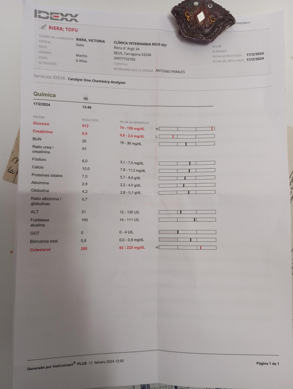 Necesito urgentemente comprar pienso para Tofu...como ya os expliqué, Tofu llegó de Cádiz hace poco más de dos meses y además de ser positivo en inmuno, aquí descubrí trás una analítica porque algo no me cuadraba en su día a día, que era diabético, tenía la glucosa a 612....desde entonces está con insulina pero sigue con el azúcar muy alto (no baja de 340)....por ello es necesaria la alimentación especial sólo para él. 1'5 kg de pienso para Diabéticos cuesta 27€...+ Sus latitas....no olvidéis que tengo 6 gatos más que toman pienso especial para los problemas de cristales de estruvita.