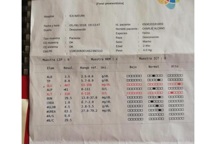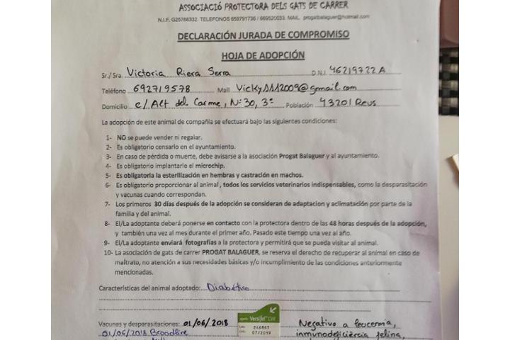Os presento a Charly... Charly es un gatito de dos años al que su familia abandonó al detectar que estaba malito... Fué recogido por la asociación progat Balaguer quien lo llevó al veterinario en donde le han diagnosticado "Diabetis".... Cuando me enteré del caso me faltó tiempo para ir a buscarlo porque soy consciente de que un gato adulto y enfermo tiene muy pocas posibilidades de ser adoptado.... Así que aquí lo tengo... Adaptándose bastante bien él... No tan bien mis otros tres gatos, y aprendiendo yo a cuidar y controlar una diabetis felina.... Estoy esperando a liquidar la deuda de PLUM en el veterinario para poder empezar con las analíticas y controles de glucèmia de Charly. De momento me han donado un Glucometro y toda la insulina que necesite (desde Reus y Sant Celoni)... En fin... Aquí os dejo una foto de Charly y de su contrato de adopción y de sus últimas analíticas....