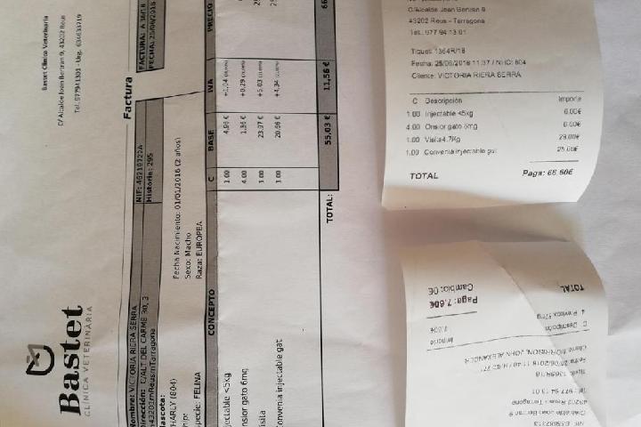 Factura del veterinario de la última revisión de Charly... La conjuntivitis se está cronificando... Su patita esta mucho mejor pero aun necesita medicación... Boneys, la gata mayor se ha estrenado y está con un brote agudo de cistitis.... Suma y sigue...